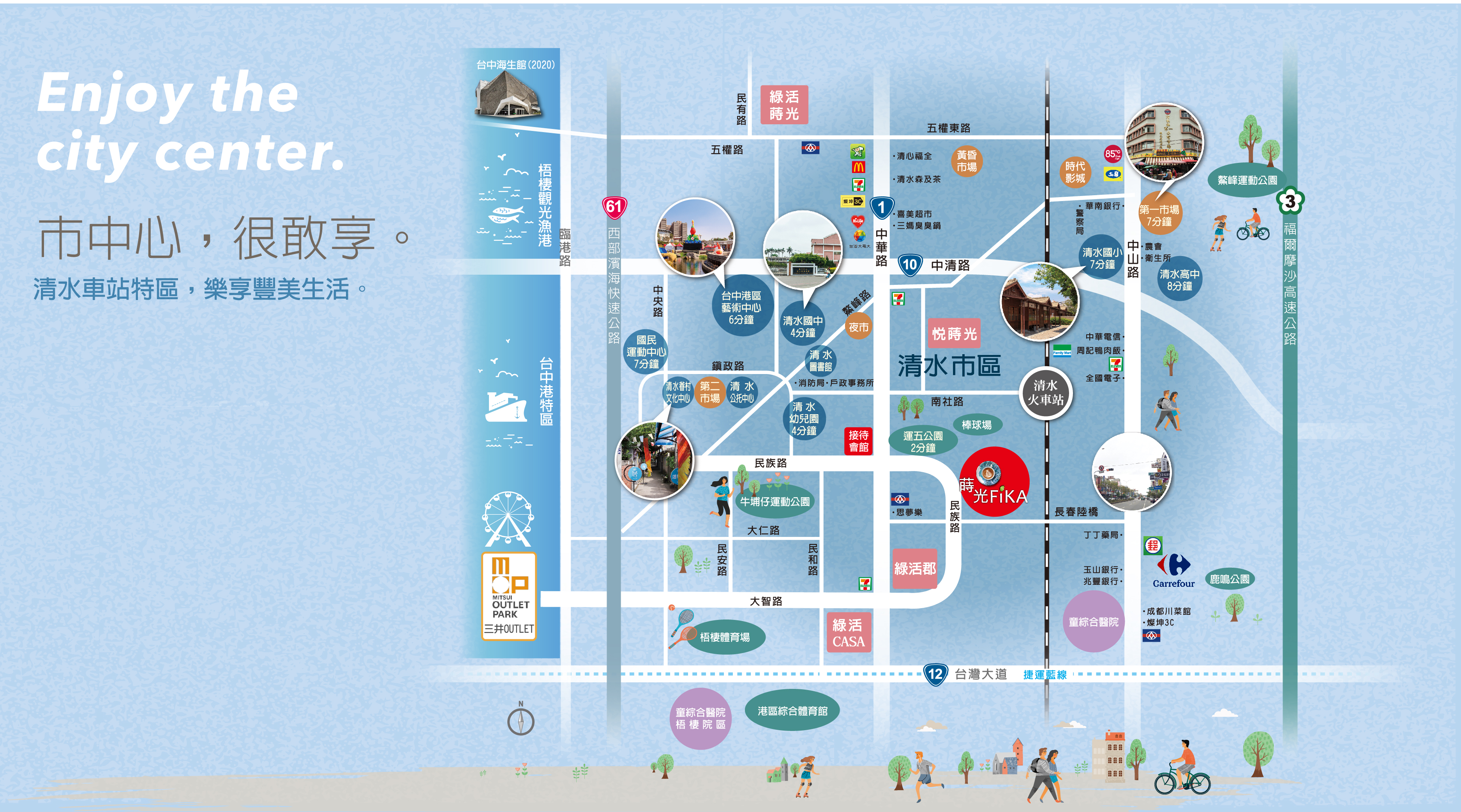紫雲巖9分鐘、清水服務區13分鐘、三井Outlet 15分鐘